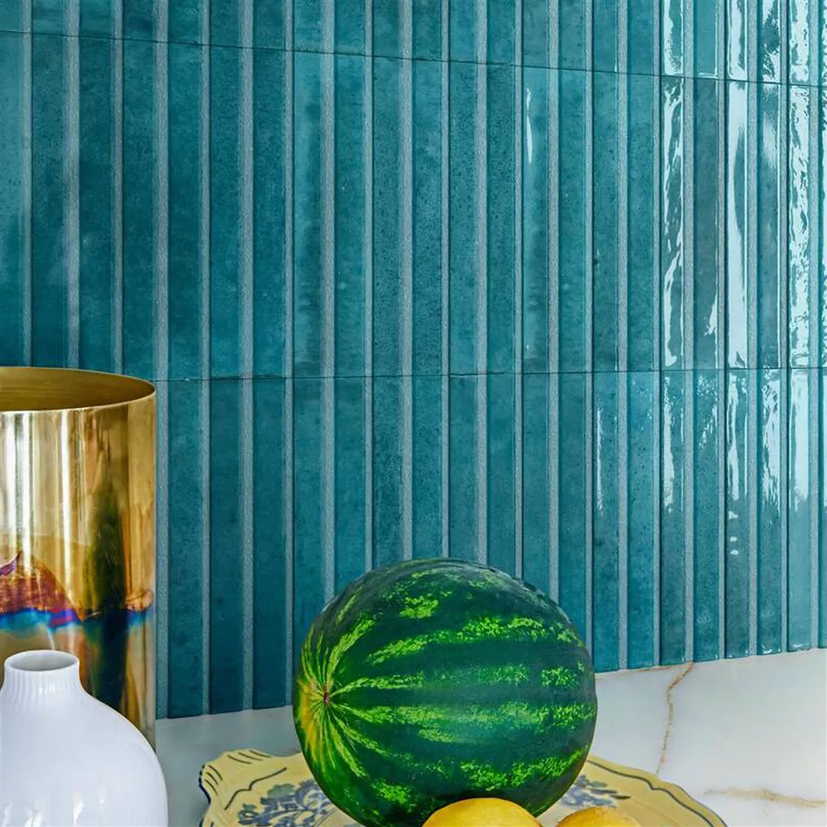 Entdecken Sie die Vielfalt der Artemis Wandfliese aus Feinsteinzeug. Hervorragend für diverse Innenräume wie Küche, Badezimmer, Waschraum, Abstellraum, Flur und Wohnzimmer geeignet, verleiht diese Fliese Ihrem Raum eine frische, moderne Ästhetik. Die glasierte und glänzende Meerblau-Farbe erzeugt dabei eine einzigartige 3D-Optik.