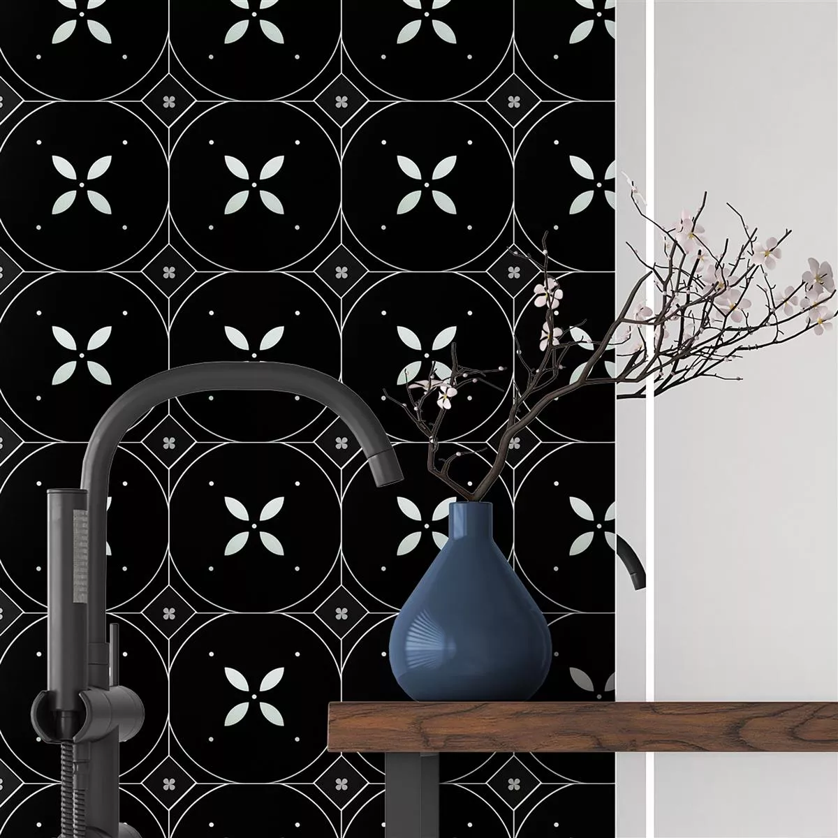 Die Feinsteinzeug Fliesen Genexia Schwarz Weiß Decor 1 Einleger bringen zeitlose Eleganz in jedes Interieur. Das quadratische Format mit einer matten Oberfläche eignet sich sowohl für Wände als auch für Böden, und ihr dekoratives Schwarz-Weiß-Design verleiht Ihren Räumen eine besondere Note.