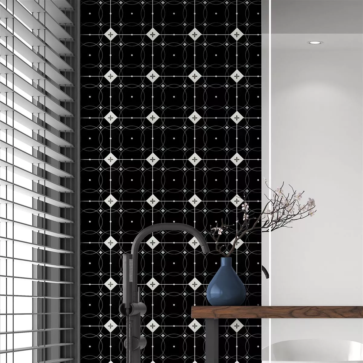 Die Feinsteinzeug Fliesen Genexia Schwarz Weiß Decor 1 Octagon verleihen Ihren Räumen Retro-Chic und zeitlose Eleganz. Mit einem Blumenoptik-Muster in Schwarz und Weiß sowie dem charakteristischen Octagon-Format setzen sie stilvolle Akzente in Küchen, Bädern und Wohnräumen.