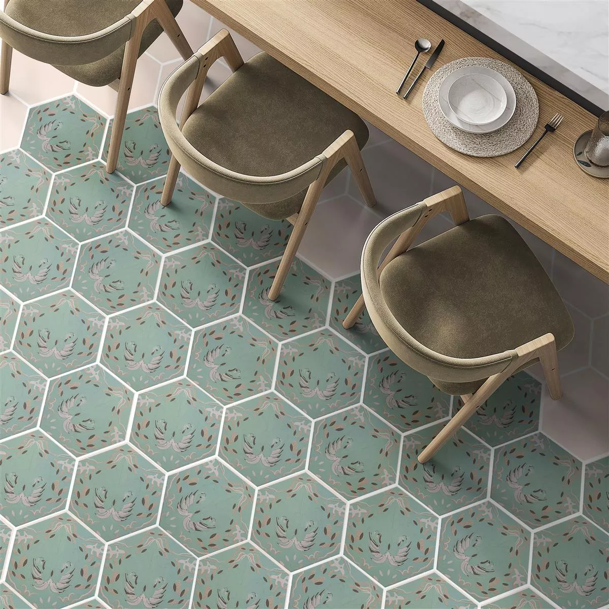 Die Feinsteinzeug Fliesen "Modena Hexagon Decor 5" bieten eine harmonische Fusion aus Funktionalität und ästhetischem Design. Mit einer Stärke von 10mm eignen sie sich ideal für Nassbereiche, Dusche, Bad, Küche, Wohnraum und Innenbereiche. Die matte Oberfläche und das florale Ornament-Motiv in Grün verleihen den Fliesen eine zeitlose Eleganz.