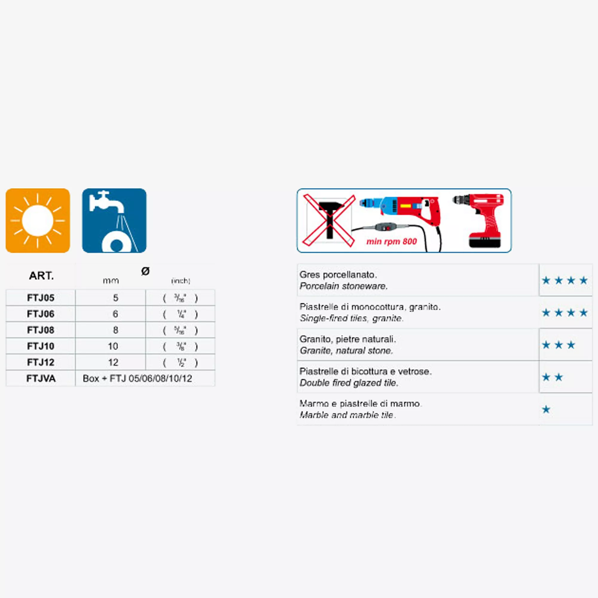 Geeignet ist die Bohrkrone mit Diamant für eine Bohrmaschine ab 800 Umdrehungen je Minute. Bei niedrigeren Geschwindigkeiten ist die Krone nicht anwendbar. Sie sorgt für einen sauberen Schnitt und versucht Risse in den Fliesen zu verhindern. Jede Größe ist einzeln erhältlich. Damit sie von anderen Herstellern gut zu unterscheiden ist, wurde sie grün lackiert. Die einzelnen Größen sind 5mm, 6mm, 8mm, 10mm und 12mm Durchmesser. Um beste Ergebnisse zu erzielen, empfiehlt es sich die Flächen vorher sauber zu wischen. Die Fliesen können sowohl im einzelnen Zustand als auch verbaut an der Wand bearbeitet werden. Mit etwas Wasser an der Bohrkrone wird Überhitzung verhindert. Der Diamant ist lange haltbar und kann über viele male sehr gute Anwendung finden.