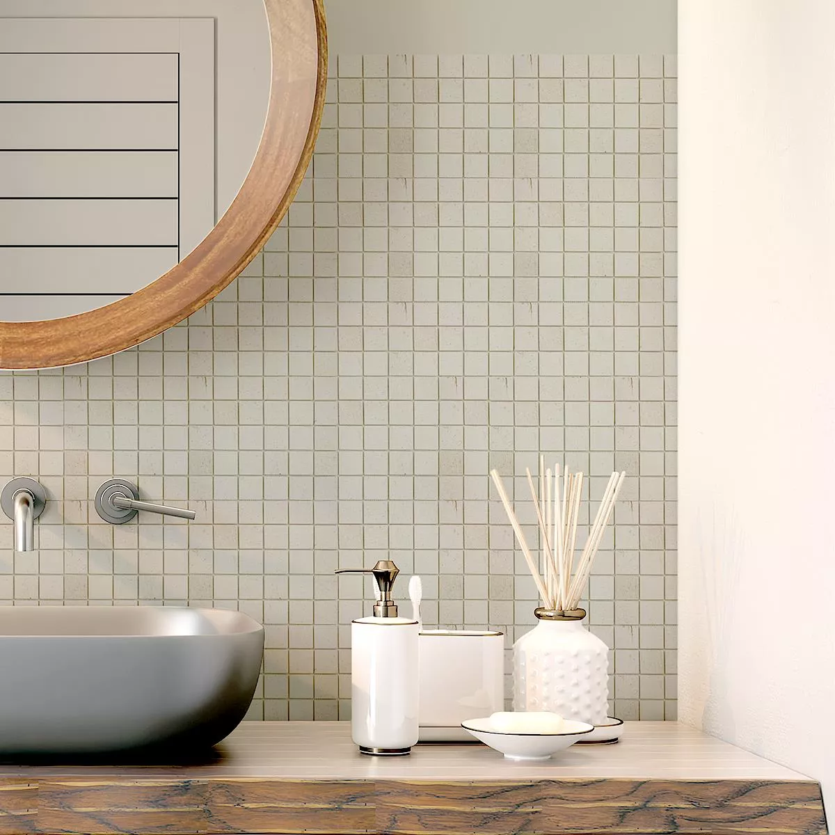 Jede Fliese und jedes Mosaik haben aufgrund individueller Materialeigenschaften und Anwendungsbedingungen unterschiedliche Anforderungen an das Zuschneiden, Verlegen und Verarbeiten. Fragen Sie einen örtlichen Experten für das korrekte und sichere Verlegen Ihrer Mosaike oder Fliesen. Wir haften nicht für unsachgemäßen Gebrauch und fehlerhafte Verarbeitung von Baumaterialien.