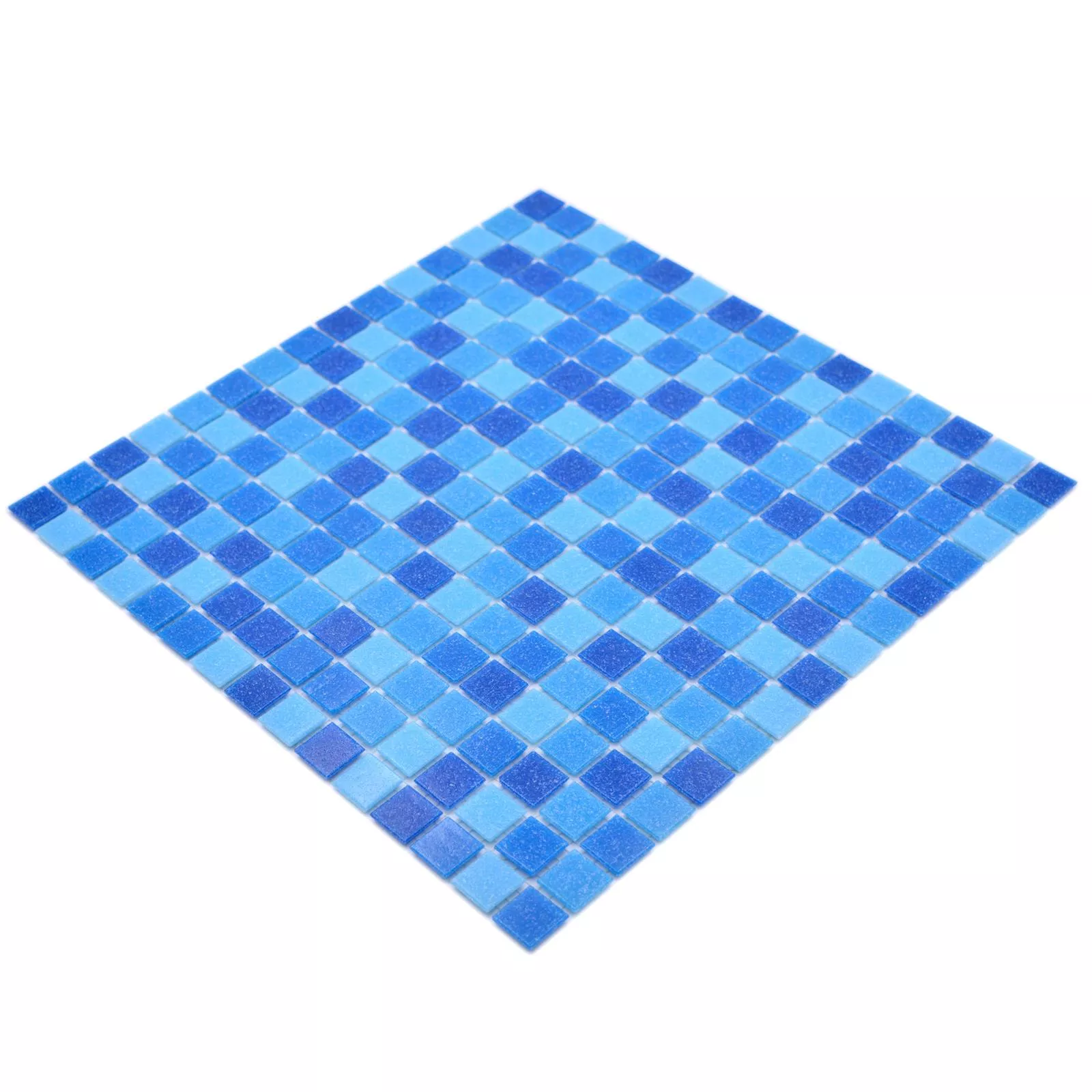 Unsere Fliesen für Ihr Schwimmbad: Der intensive Blau - Hellblau Mix wird den Pool in ein ansprechendes Nass verwandeln, denn das Wasser erhält eine wunderbare klare Farbe. Von weitem erscheint es als hätten Sie sich die Nord See nach Hause geholt. Es sind Mosaikfliesen, die auf einzelnen Matten papierverklebt sind, damit die Verlegung schnell von der Hand geht. Dazu bedarf es nicht nur eine Profihand. Die quadratischen Matten lassen sich einfach in den Pool verlegen. Mit einem Messer kann das Gewebe geschnitten werden und der benötigten Größe angepasst werden.